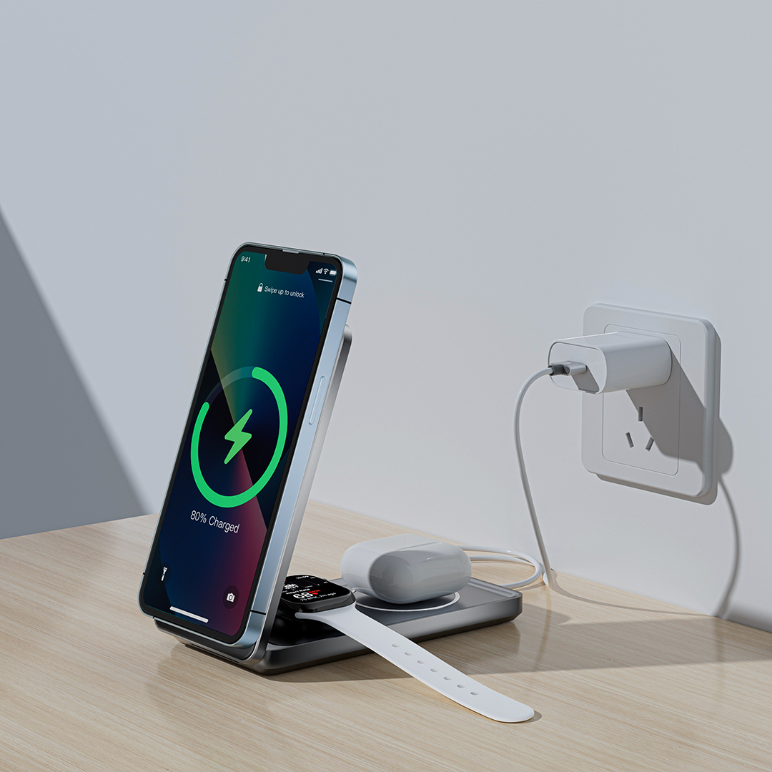 Carregador por Indução 3 em 1 com tecnologia MAGSAFE, Multifuncional, Compacto, Dobrável, FAST CHARGER 20W, para carregamento wireless, marca FAM, Modelo FCA-QW31M. Carregamento simultâneo triplo, por indução para Celular Android/IOS, Relógio (Apple Watches) e Fones de Ouvidos (Airpods e compatíveis).