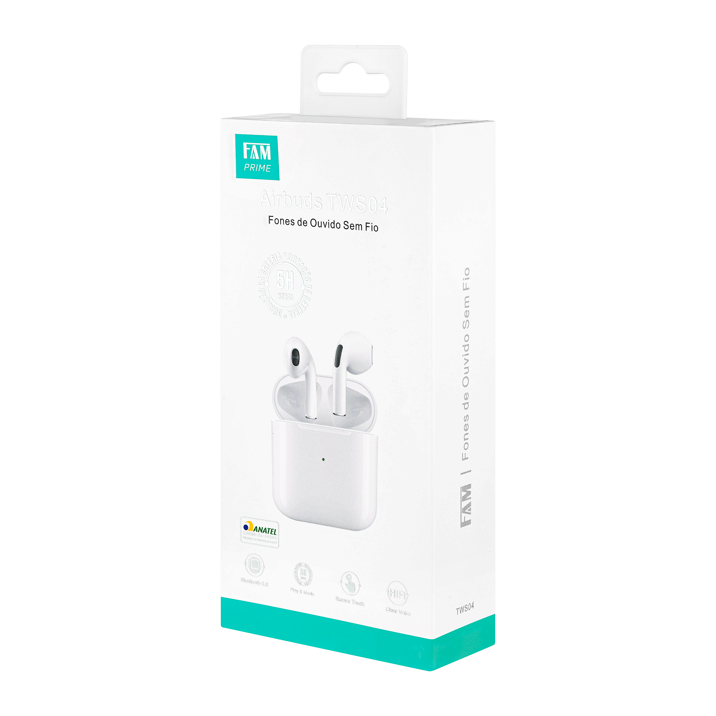 Fone de ouvido sem fio, Airbuds TWS (True Wireless Stereo), marca FAM, conexão Bluetooth 5.0, Microfone com tecnologia Hi-Fi Clear Voice, Sensor Touch, contendo bateria interna recarregável com capacidade de duração aproximada de 5hs de conversação.
